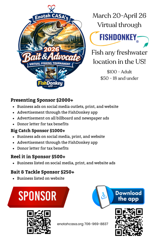 Join Enotah CASA’s 2026 Bait & Advocate: Virtual Fishing Tournament to raise funds to support children experiencing foster care. Fish any freshwater location in the US!