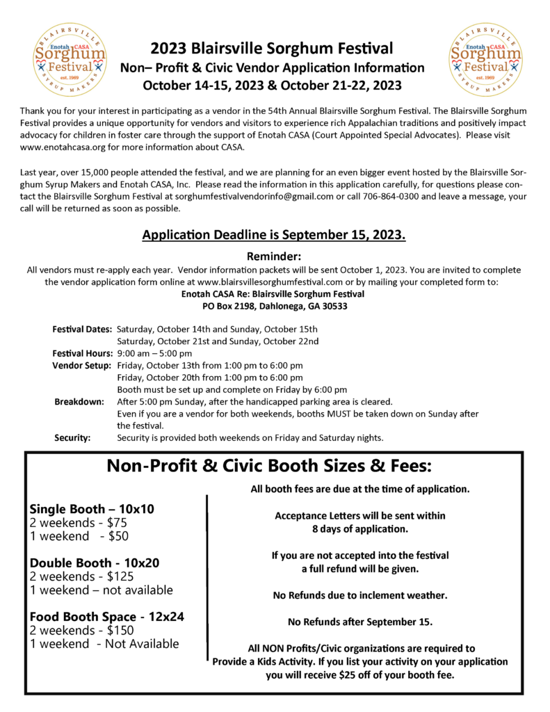 As a vendor at the event, you represent the Blairsville Sorghum Festival. If you do not conduct yourself in a professional manner, you will be asked to leave immediately without the refund of your vendor fee or deposit. This is a juried show the Blairsville Sorghum Festival reserves the right of final interpretation of all rules. We reserve the right to approve and deny applications to ensure that the quality of vendors meet the criteria of our event. All non-food products must be hand crafted. Vendor selection and placement will be based on creating the most profitable event possible for you while creating diversity for patrons. YOU MAY REQUEST THE SAME BOOTH LOCATION & WE WILL TRY OUR BEST, BUT WE MAKE NO GUARANTEES. Any vendor who cancels within 2 weeks of the festival may not be considered for future festivals.